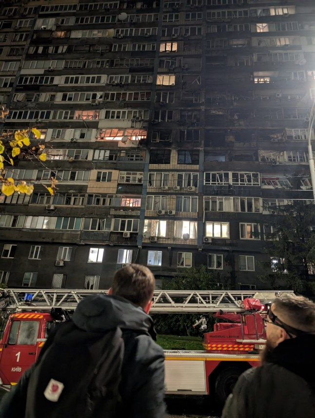 Some 12 people were wounded in Kyiv after a 17-storey residential tower block in the Pechersk district was hit by missiles.