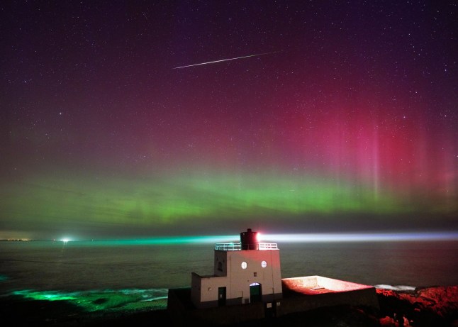 A meteor appears as the aurora borealis,commonly known as the Northern Lights,light up the skies above Bamburgh lighthouse in Northumberland during a G3 solar storm last night (Picture: Owen Humphrey